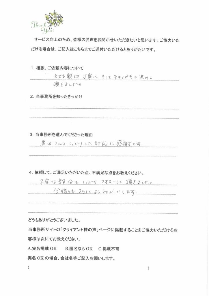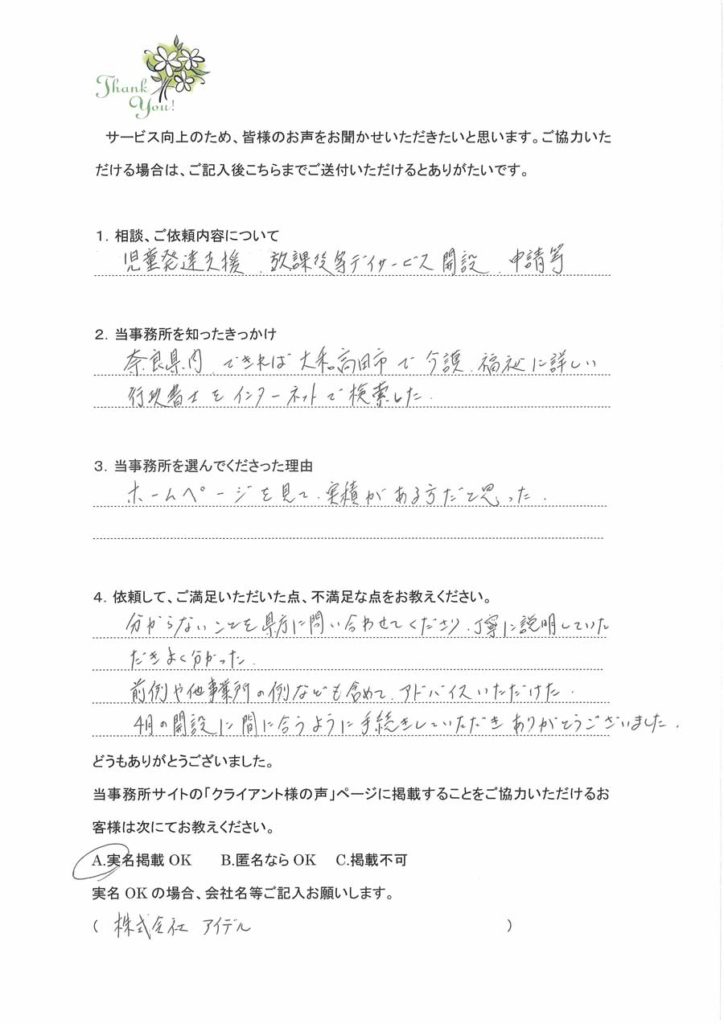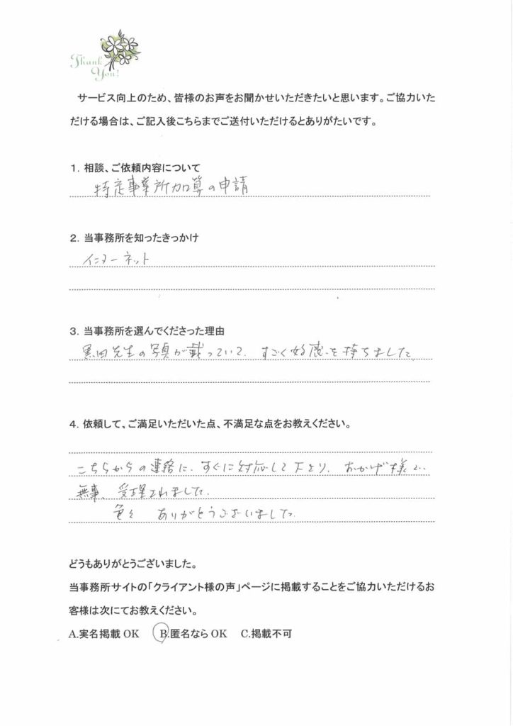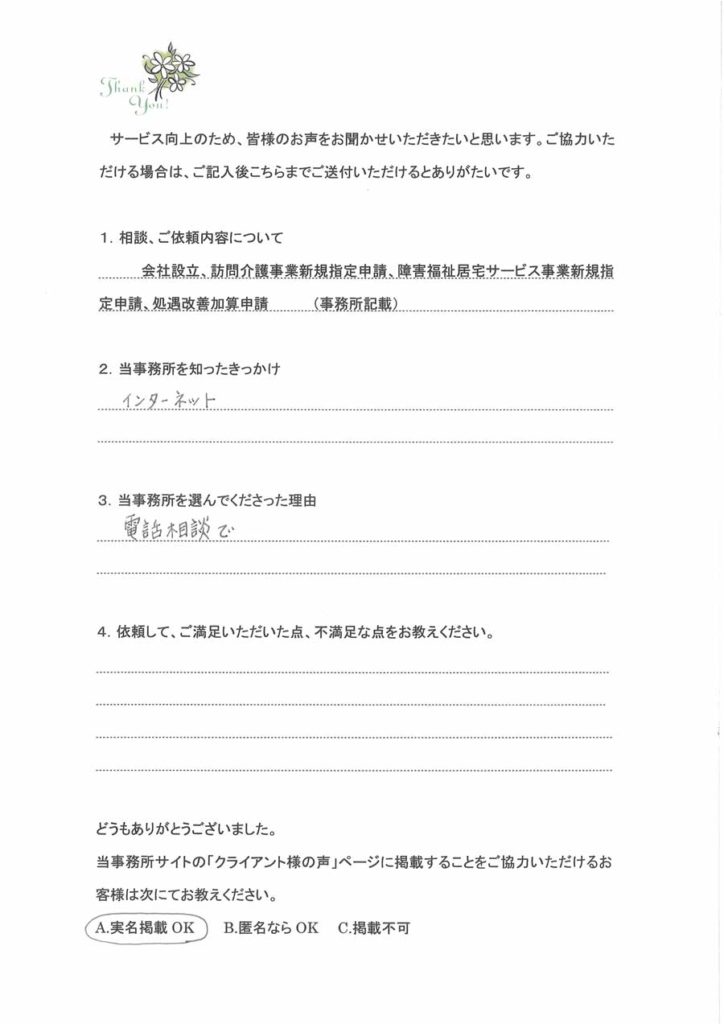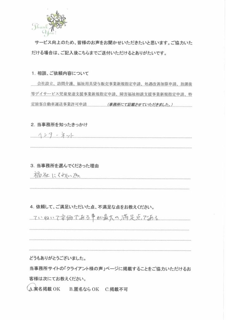 訪問介護事業立ち上げのお客様株式会社設立からお世話になりました。会社設立の時の定款作成の目的について関連する事業のアドバイスをいただき、すべてに合った目的を入れて設立していただきました。介護事業所指定、介護タクシー許可もスムーズにおりまして開業開始できました。
